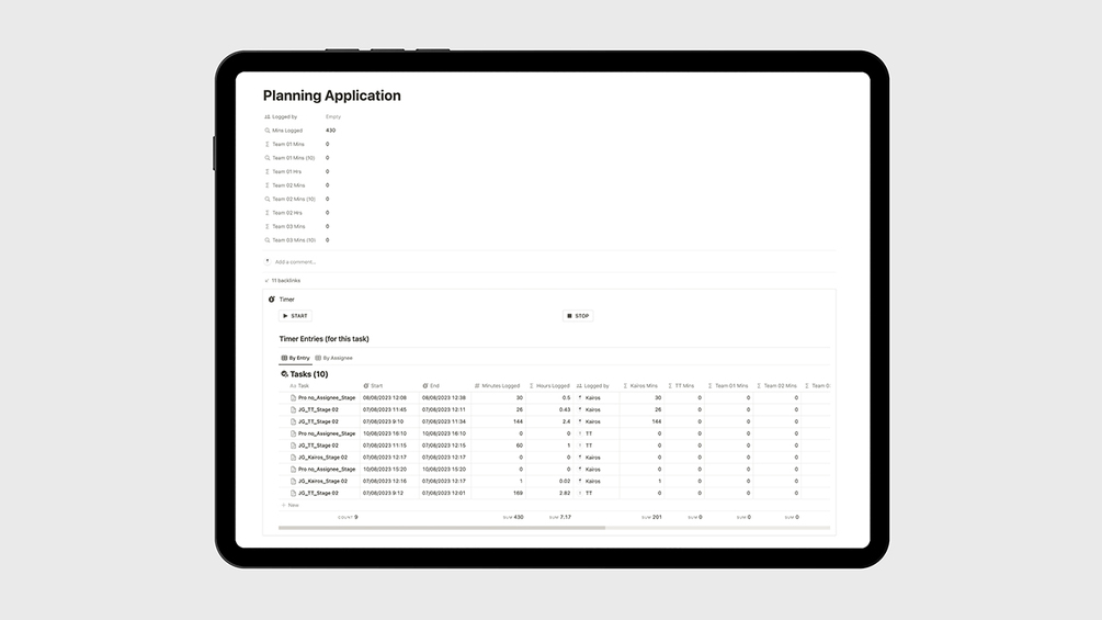 The PRO template offers in-depth project planning, encompassing logged hours categorized by team and project. It also automates the generation of project health reports, compiling project information and team workload seamlessly.
